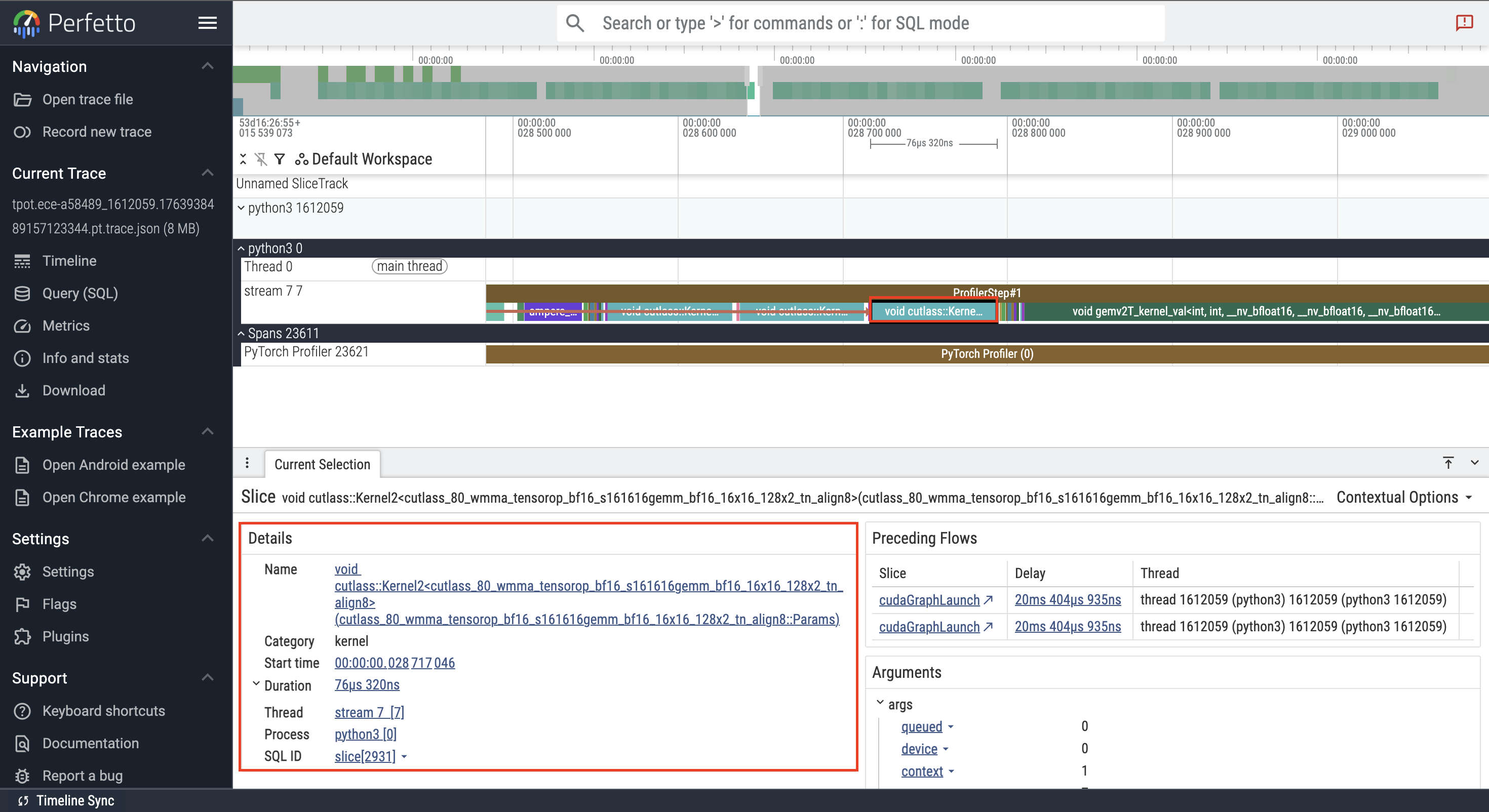 We use torch profile to generate a json trace file and visualize it with Perfetto.